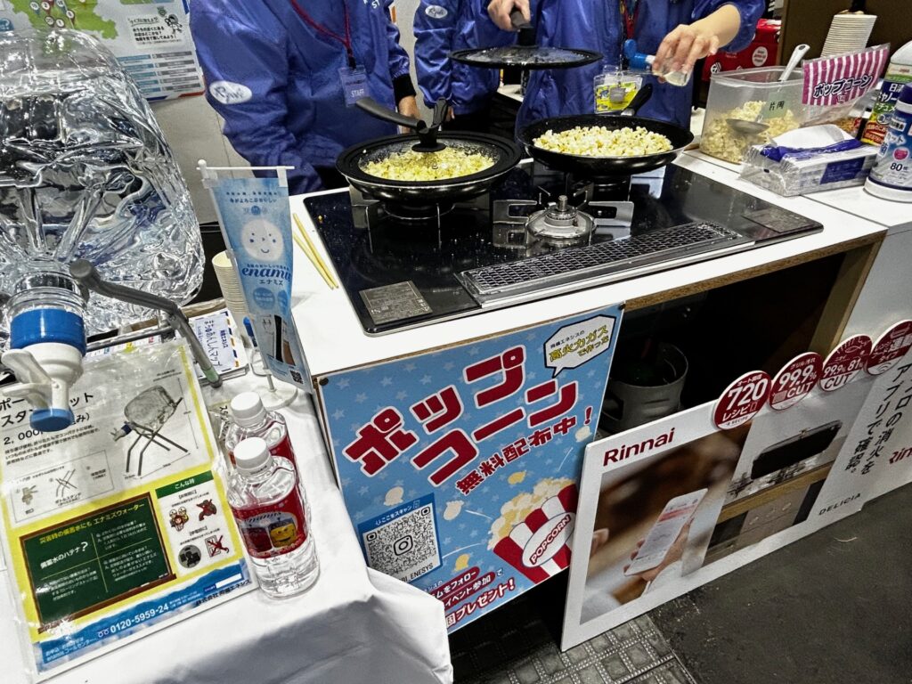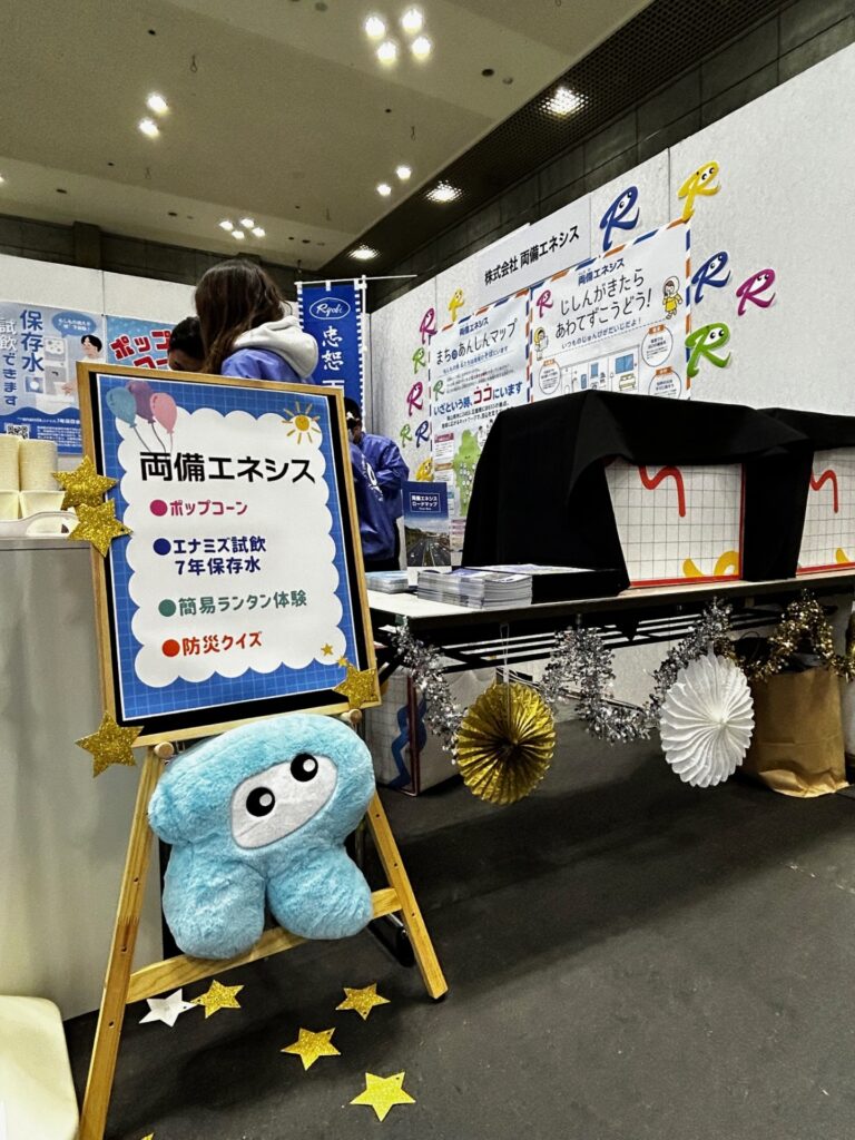 ブースでは、ポップコーンの配布や「エナミズ7年保存水」の試飲、ペットボトルランタン体験、防災クイズなど、楽しみながら防災について学べるコンテンツを実施しました。